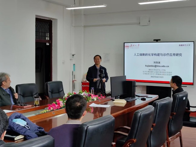 4月12日至13日,湖南省科技创新领军人才、湖南省杰出青年、中国十大新锐科技人物、湖南大学化学化工学院刘剑波教授应邀到我院进行学术交流,作题为《人工细胞的化学构建及其诊疗应用研究》学术讲座。讲座由化学化工学院副院长崔现宝主持,学院教师及博士研究生参加了交流。