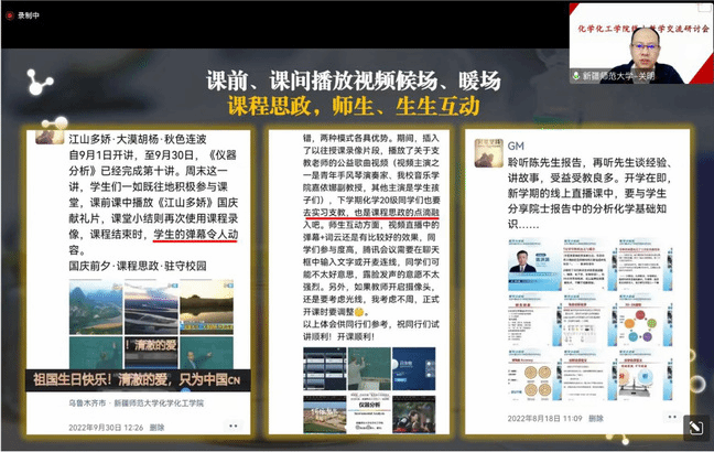 交流会最后,由化学化工学院院长关明教授以《仪器分析》教学为例为全院教师做示范汇报。关明以任务发布、师生互动、过程考核、课题引入、重点讲解及拓展延伸等方面的应用为例,展示了一堂课程从课前、课中到课后的铺设与连接,并提出了以学生为中心,用心备课,用情授课,构建有效线上课堂的理念。最后,莅临指导交流研讨会的校级教学督导贾德梅反馈了本学期线上教学过程中产生的一些问题和建议,并希望通过此类交流和分享活动能够进一步挖掘各类课程的亮点和特色从而进一步整体提升学院的线上教学质量。