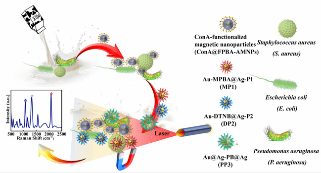 基于适配体-ConA双识别SERS生物传感器对金黄色葡萄球菌、大肠杆菌和铜绿假单胞菌的联合检测示意图