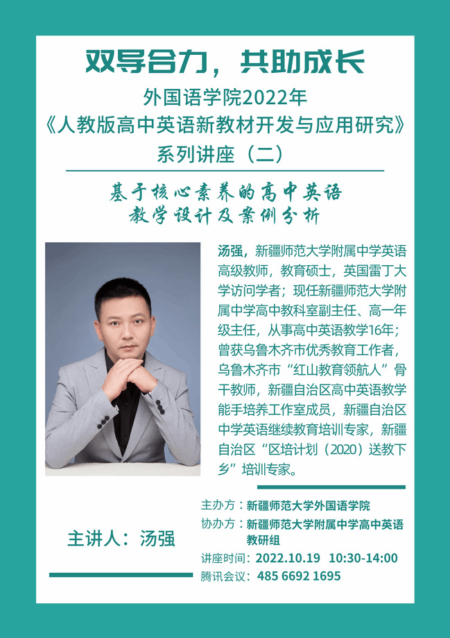 为深化高校与中小学协同育人,助力学科教学(英语)研究生教育教学实践与研究水平提升,提高研究生培养质量,外国语学院联合365英国上市公司官网附属中学高中英语教研部于10月12日至26日期间举办《人教版高中英语新教材开发与应用研究》系列讲座,围绕新教材理念、教学设计、大单元教学案例分析等方面为2022级学科教学(英语)研究生开展系列讲座。