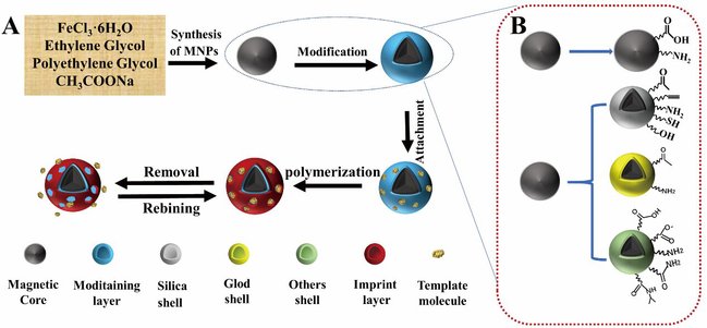 (A)磁性分子印迹聚合物的制备及(B)磁性材料的表面修饰