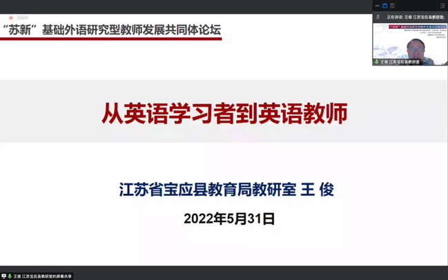 5月31日晚,365英国外国语学院与苏州大学外国语学院联合举办“苏新”基础外语研究型教师发展共同体论坛第二讲暨教育部中学教师教育虚拟教研室(英语学科)联动活动。本次活动主题为“如何成为优秀的职前英语教师:来自一线研究型教师的建议”,由江苏省英语特级教师、正高级教师、扬州市宝应县教研室教研员王俊主讲,与谈人分别是宁波外国语学校教师熊亦波、江苏省锡东高级中学教师陈玉松和苏州星汇学校教师王志祥。