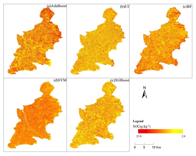 研究结果表明,XGBoost和RF模型的SOC含量预测精度最高,研究区SOC含量变化的主要驱动变量为EVI、EVI2和SAVI,未利用地有机碳含量变化的主要驱动变量为SATVI,耕地和林地有机碳含量变化的主要驱动变量分别为DFI和CI。与AdaBoost、ET、SVM和XGBoost模型相比,RF模型在预测SOC含量方面表现出更好的效果。基于研究区的预测模型,区分不同土地利用类型的预测模型模拟精度更高。