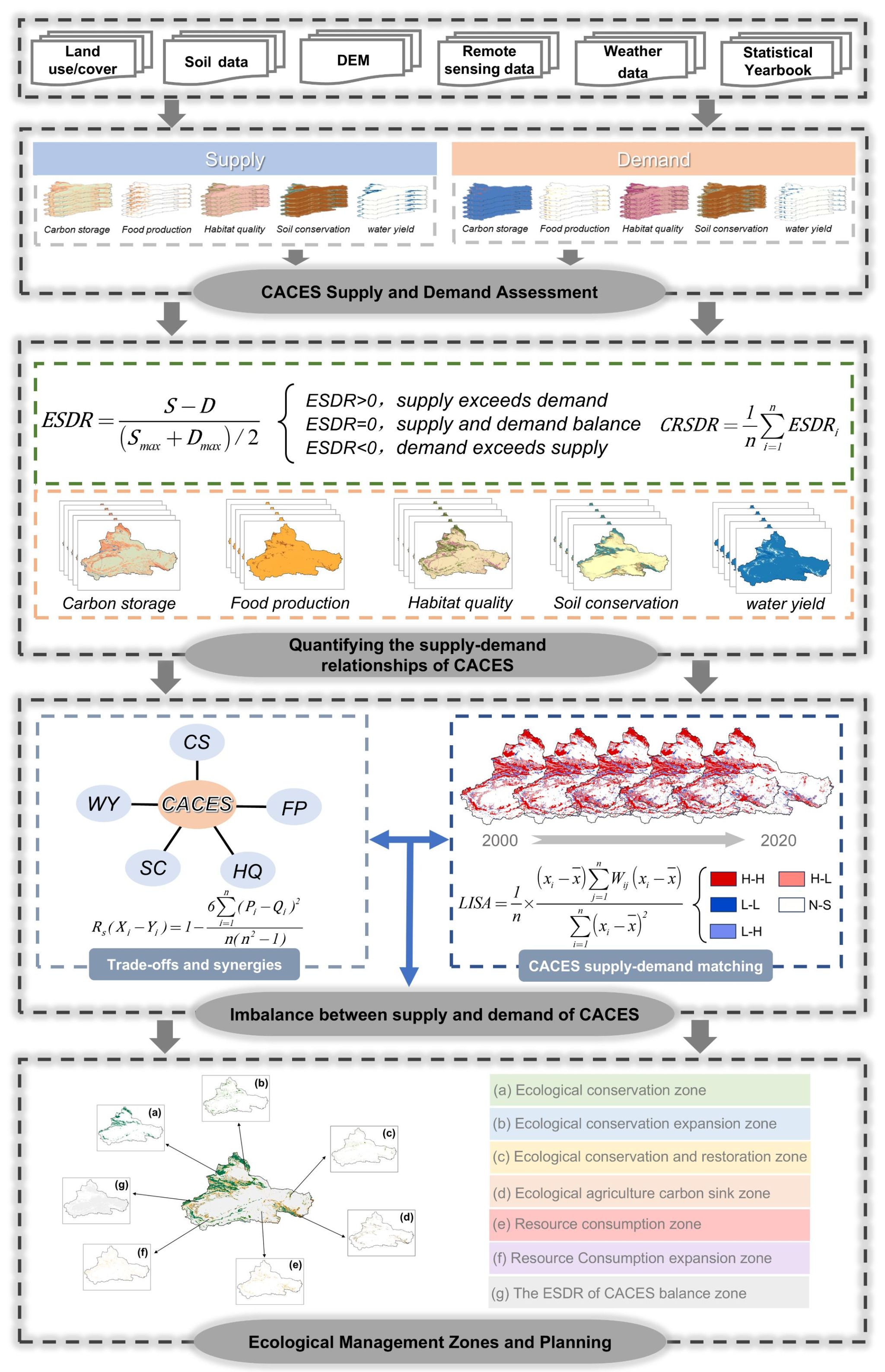 生态系统服务作为自然生态系统向人类提供的多种关键功能和资源,对区域可持续发展至关重要。然而,中国西北干旱区因气候干旱、水资源匮乏及人为干扰,其碳及各类生态系统服务的供需关系持续失衡,已严重制约当地的绿色发展。为应对这一挑战,在“双碳”目标背景下,365英国王勇辉教授团队率先从碳视角提出了一套生态系统服务供需分析框架,并通过时空模拟,系统揭示了碳及相关服务的供需变化特征及其权衡协同机制。该研究不仅首次揭示了该区域生态系统服务的空间失配格局及演变趋势,还针对划分的七个生态管理区域提出了切实可行的高质量发展策略,为实现“双碳”目标和推进生态文明建设提供了关键参考。