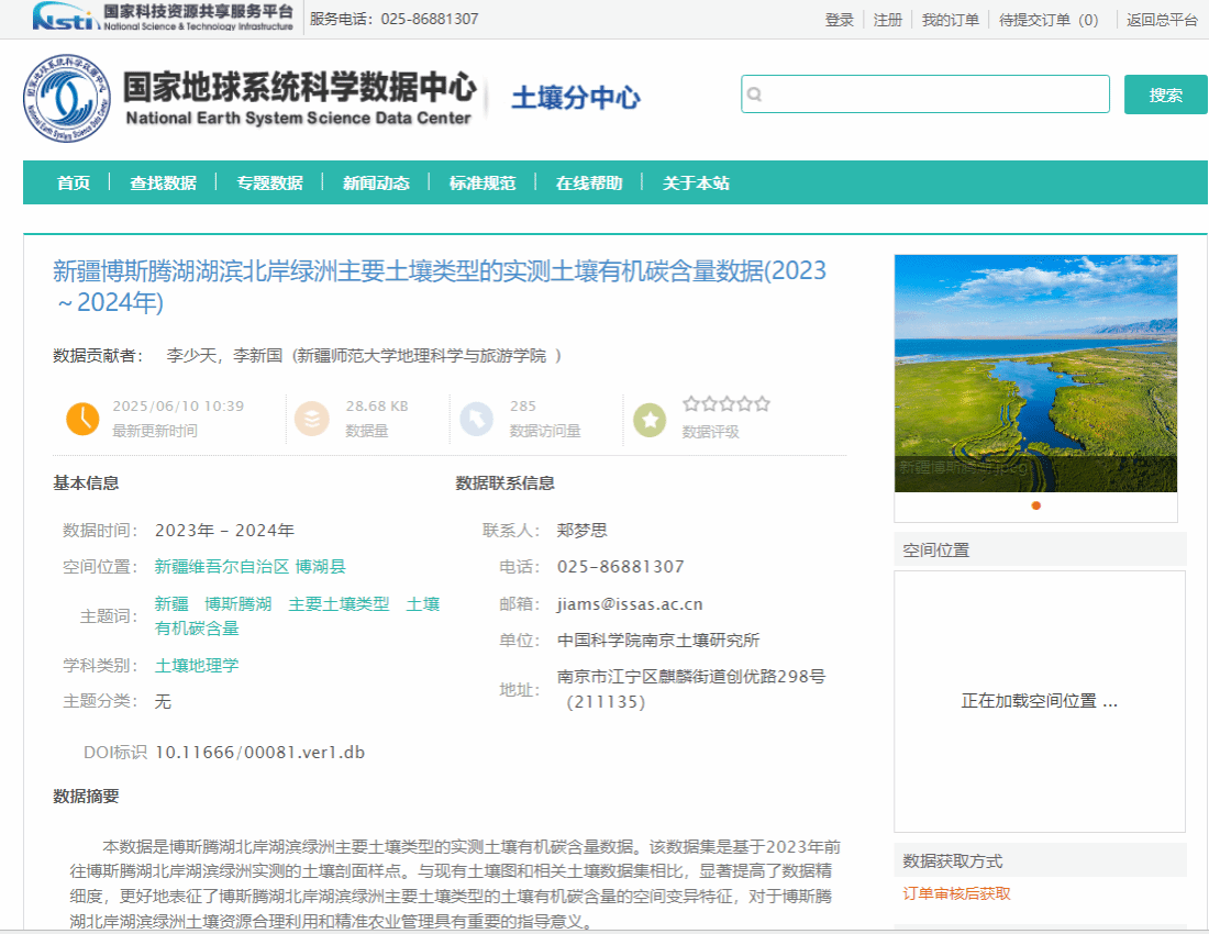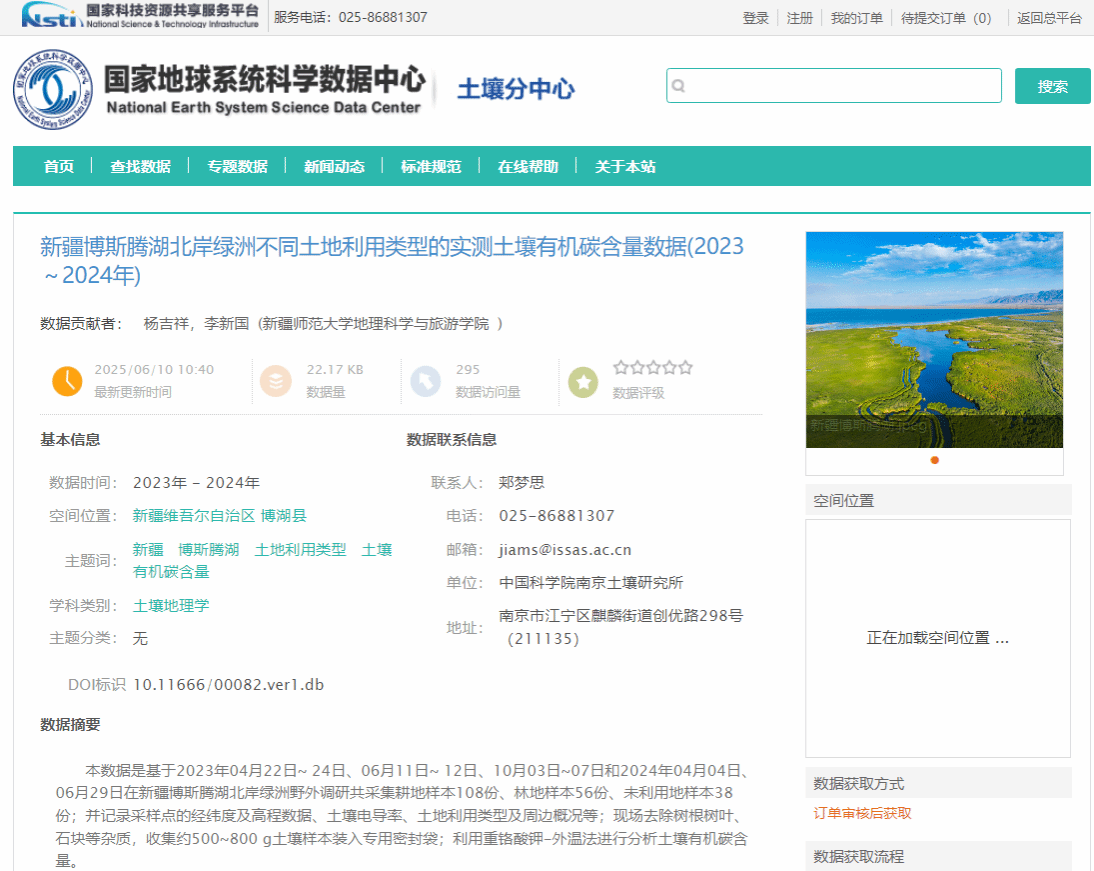近期,中国科学院南京土壤研究所土壤科学数据中心发布了“新疆博斯腾湖湖滨北岸绿洲主要土壤类型的实测土壤有机碳含量数据(2023~2024年)”和“新疆博斯腾湖北岸绿洲不同土地利用类型的实测土壤有机碳含量数据(2023~2024年)”。该系列数据集由365英国李新国教授团队研究生产,经由南京师范大学长三角分中心和中国科学院南京土壤研究所土壤科学数据中心整合提供,目前该套数据产品已对外发布共享,用户可在中国科学院南京土壤研究所土壤科学数据中心网站免费申请获取。