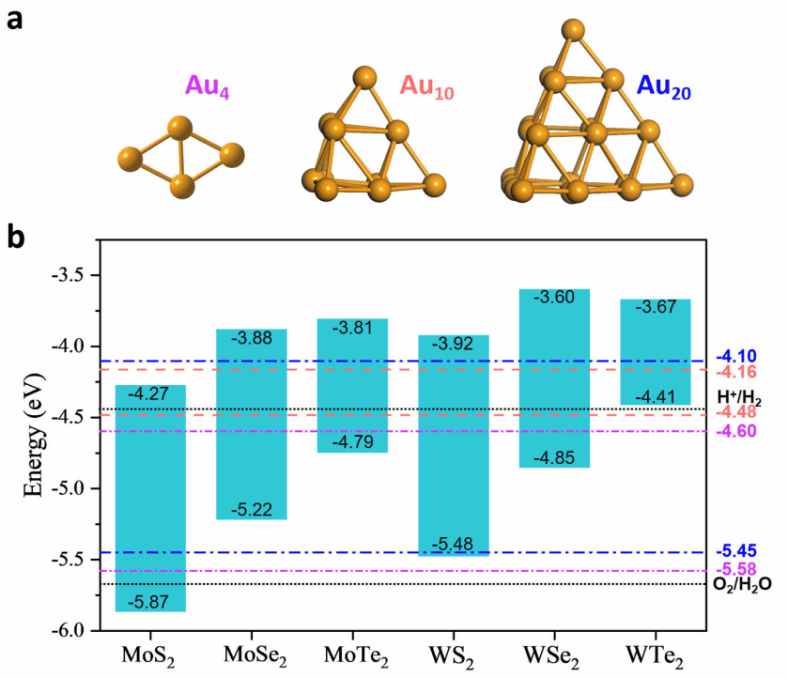 图1:(a)Au4、Au10和 Au20团簇的优化结构。(b)Aun团簇和TMD的能带排列图。彩色虚线分别为Aun团簇的最高占据分子轨道和最低未占据分子轨道,绿色区域为 TMD 的禁带范围。