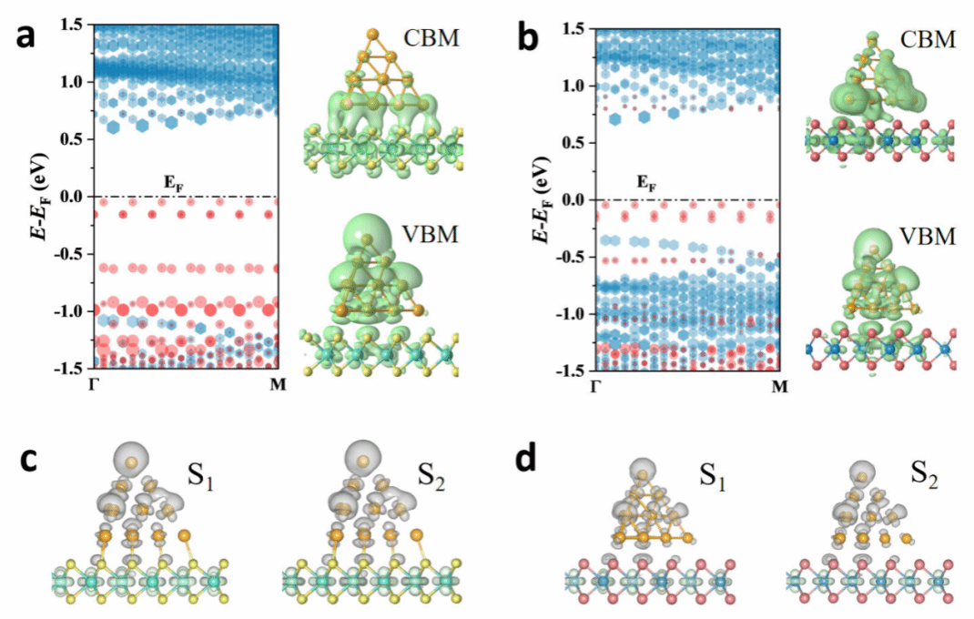 图2:(a) Au20/MoS2 和 (b) Au20/WTe2 在价带顶/导带底附近的投影能带结构和电荷密度分布。投影能带图中圆圈的大小表示每个能带中对Au20(红色)和 TMD(蓝色)有贡献的电子态比例。(c) Au20/MoS2和 (d)Au20/WTe2的第一和第二激发态电子(绿色)和空穴(灰色)在实空间的分布。