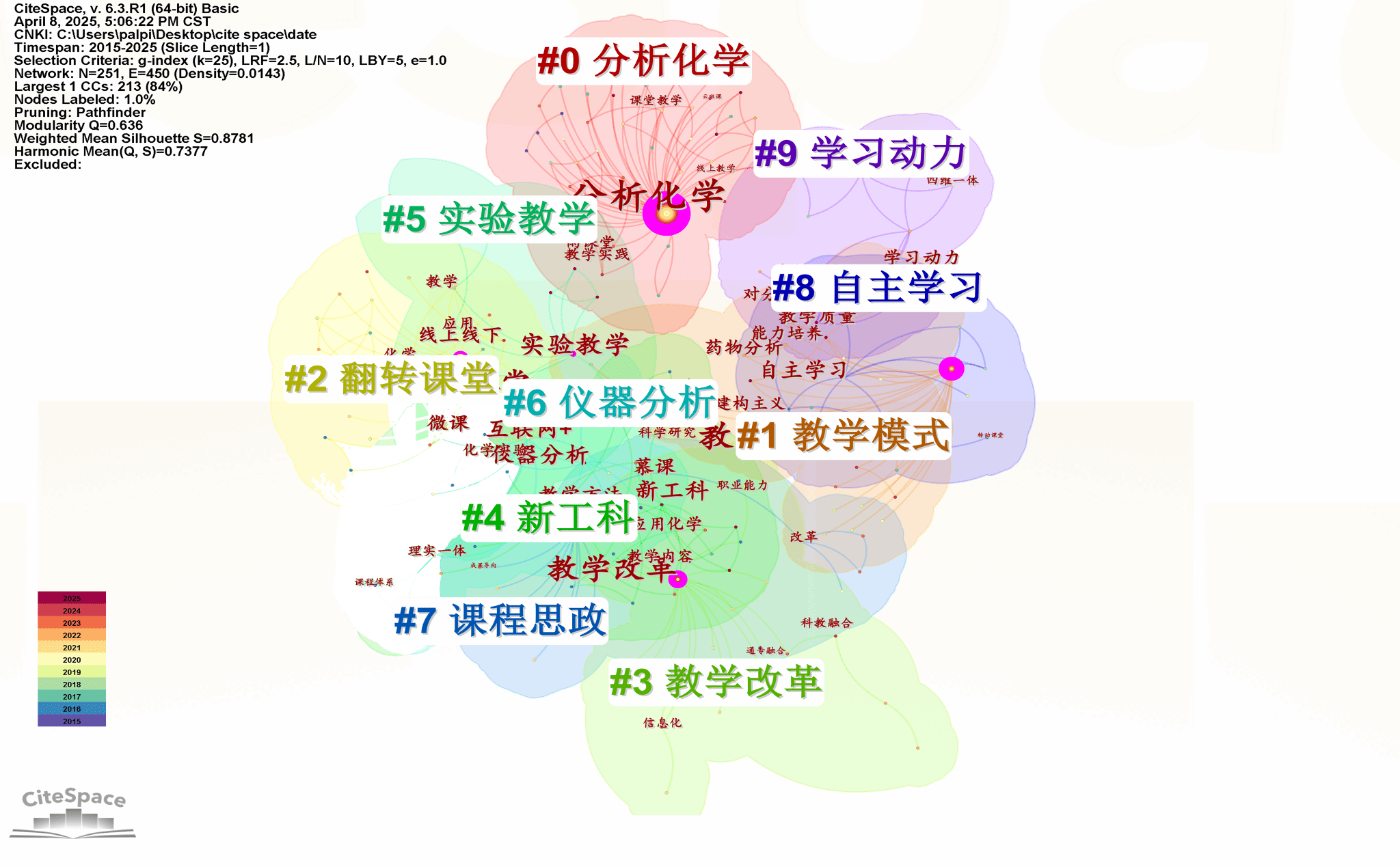 研究基于CiteSpace 6.3 R1文献计量工具,系统分析了2015年至2025年间中国知网数据库中397篇与分析化学教学模式改革相关的文献,通过可视化手段系统揭示了该领域的研究热点、演进路径与发展趋势。