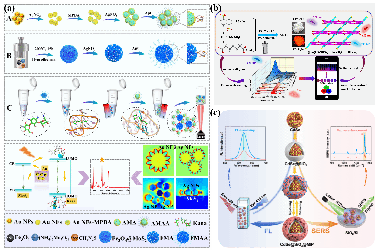(a)基于适配体修饰的双增强花状SERS传感器原理示意图;(b)比率型荧光MOF传感器示意图;(c)基于CdSe@SiO2@MIP材料SERS/FL双模传感示意图