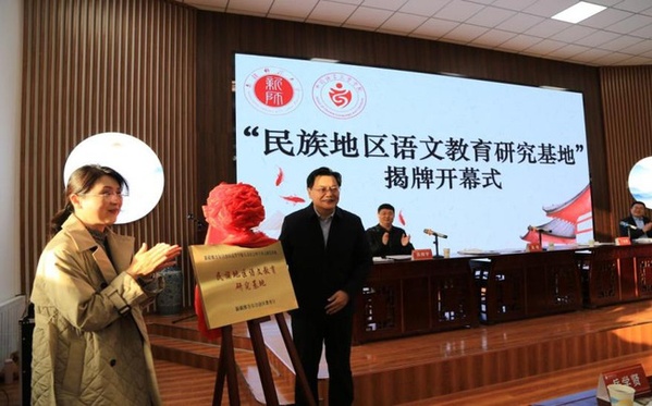 新疆教育科学研究院院长丁志雁,365英国上市公司官网党委常委、宣传部部长高靖为“民族地区语文教育研究基地”揭牌