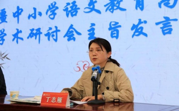 随后,丁志雁讲话,她表示,近几年新疆语文教育取得了很大进步,但部分地区仍存在着教研员短缺、教师能力水平不高等问题,希望与会高校专家和一线语文名师以此次研讨会为契机,进一步加强交流研讨,为提升新疆语文教育整体水平贡献更多智慧。