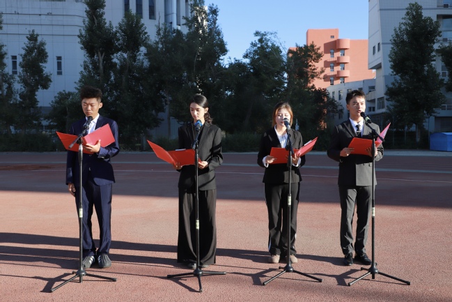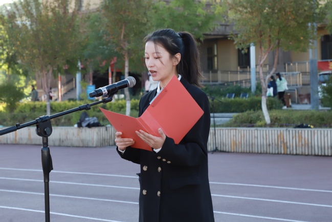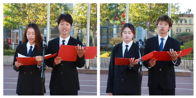 商学院人力资源管理23-8班余新慧和计算机科学技术学院软件工程24-4班陈奕阳分别作国旗下发言,号召同学们以实际行动践行教育家精神,珍惜大学时光,不负韶华。在学习上刻苦钻研,追求卓越;在品德上诚实守信,尊老爱幼;在实践上勇于担当,敢于创新。