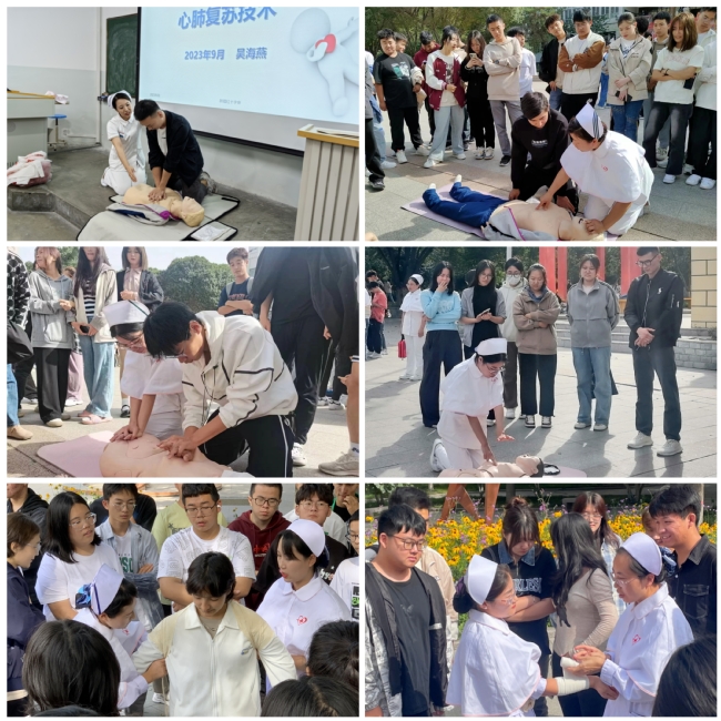 实操部分由心肺复苏、自动体外除颤仪(AED)、四肢骨折包扎步骤和创伤救护演练等几个方面组成,专业医护人员为来自18个学院的17组新生代表演示教学,旨在确保同学们掌握准确、规范的急救动作。
