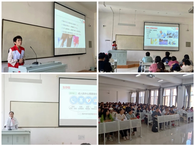 理论部分由乌鲁木齐市友谊医院重症医学科护士长杜韩梅、口腔医院纪永芳和妇幼保健院儿童保健科护士长吴海燕进行讲授,她们用专业且易于理解的语言向新生讲解了心肺复苏、海姆立克急救法、止血包扎、固定搬运等救护理论知识,并邀请学生上台练习操作。