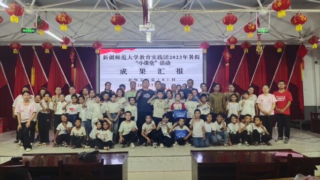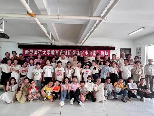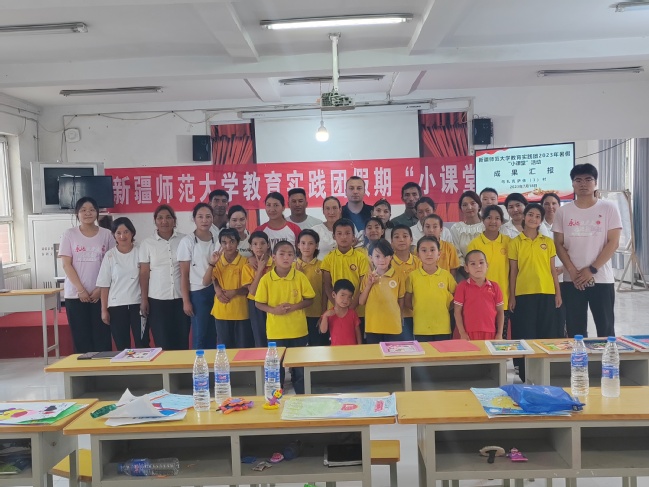 在色日克托格拉克村(4村),教育实践团成员王玺恒和刘姿开展“小课堂”活动的成果汇报会,学生们分别进行武术、舞蹈、歌曲、朗诵和美术作品展示。在大会结束后,所有参与本次“小课堂”活动的学生与老师进行了拍照留念。