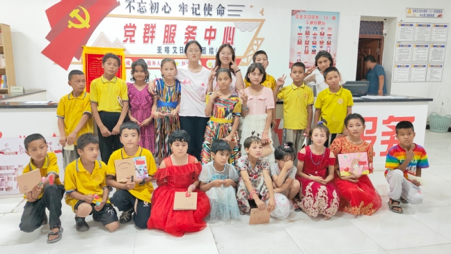 在亚喀艾日克村(8村),教育实践团成员刘月和孙瑞瑞带领孩子们开展成果汇报演出,孩子们表演了《童心向党》《仰望星空》《感恩每一天》《少年中国说》等节目。