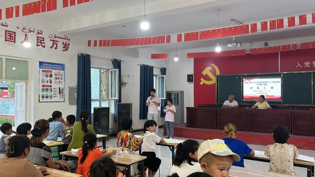 在前进村(2村),教育实践团成员阿不都沙达木·阿不都热合曼和高心倚开展了暑期“小课堂”活动的成果汇报。同学们以最认真的态度展示所学,表达所感,表示对村委会、对老师、对家长的感谢。