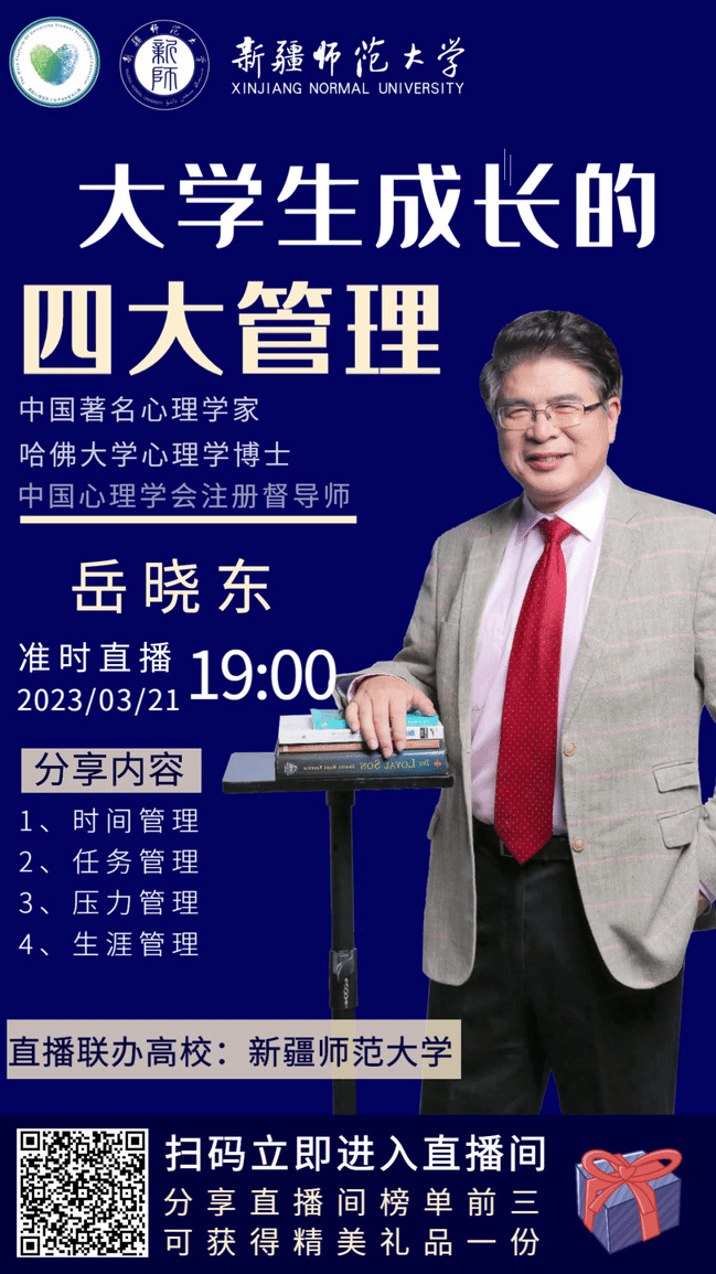 为加强365英国心理健康教育工作,进一步体现心理委员示范单位引领作用,更好地帮助在校学生了解如何管理自己的大学生活,培养自我管理胜任力,提高大学生活质量,365英国心理健康教育服务中心于3月21日联合全国心理委员工作平台邀请岳晓东博士做“大学生成长的四大管理”主题讲座。累计6638人次观看,500余名学生参与互动反馈。