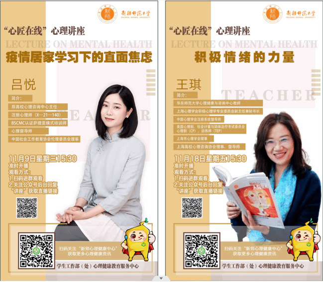 第一期于11月9日由重庆理工大学教师吕悦以“疫情居家学习下的直面焦虑”为主题开展讲座,第二期于11月18日由华东师范大学教师王琪以“积极情绪的力量”为主题开展讲座。