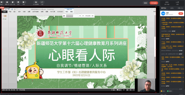 余海军从人际关系的课前调查与同学们进行线上互动,指出当前大学生人际关系的重要性。在调整人际交往的重要策略中,引导同学们去理性认清自我、明晰边界、回归二元、循序渐进、畅通沟通和寻求帮助。在反馈测评中,讲座效果总体评价8分以上占94.54%(满分10分),学生们表示通过此次讲座,正确了解了不同个体之间的思维差异,尤其是恋爱时男女思维的差异,解决了同室友和朋友们相处时的人际关系,学会了如何与舍友之间保持适当的人际距离,明白了如何将心理学理论知识真正的运用到实际生活中去。
