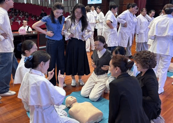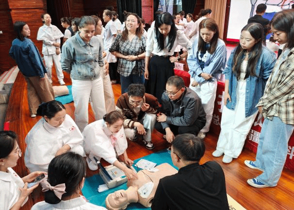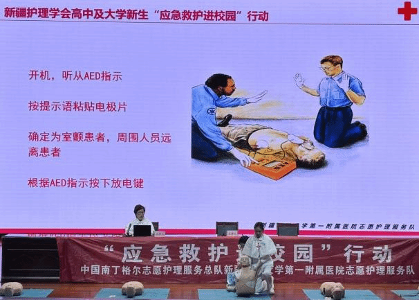 理论讲解结束后,培训团队安排专人进行AED使用演示。他们现场拆解AED设备的操作步骤,从开机、电极片粘贴位置,到“听语音指令操作”的关键要点,结合模拟案例演示了“心肺复苏+AED”的协同急救流程,强调“每一秒都关乎生命”,让师生深刻理解AED在心搏骤停救援中的“救命作用”。