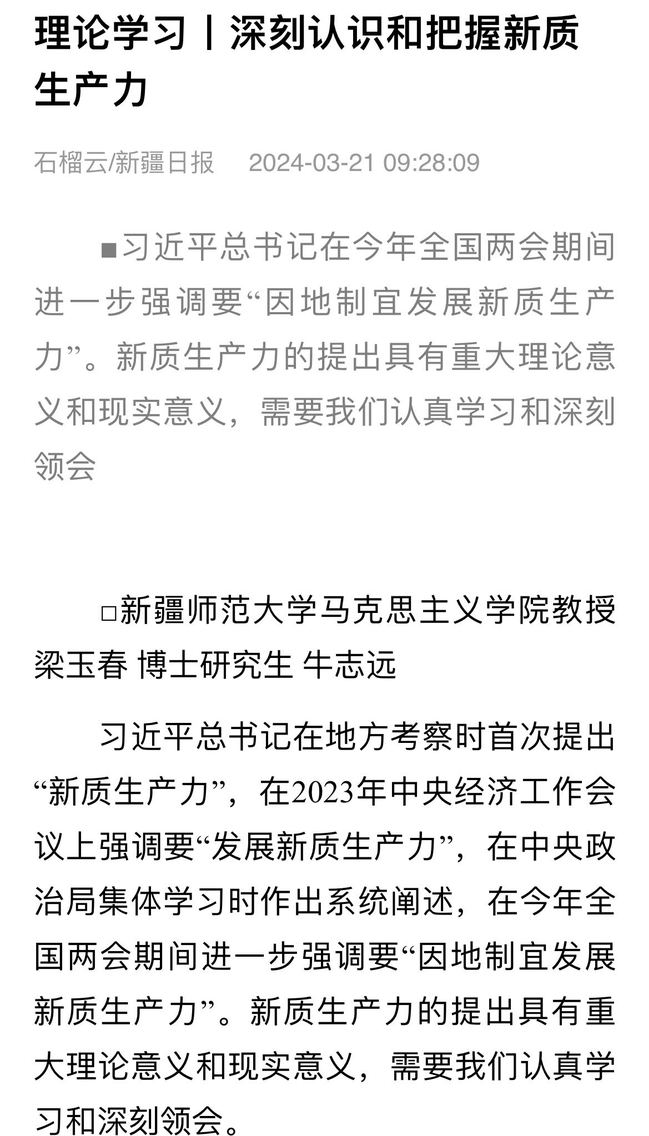 习近平总书记在地方考察时首次提出“新质生产力”,在2023年中央经济工作会议上强调要“发展新质生产力”,在中央政治局集体学习时作出系统阐述,在今年全国两会期间进一步强调要“因地制宜发展新质生产力”。新质生产力的提出具有重大理论意义和现实意义,需要我们认真学习和深刻领会。