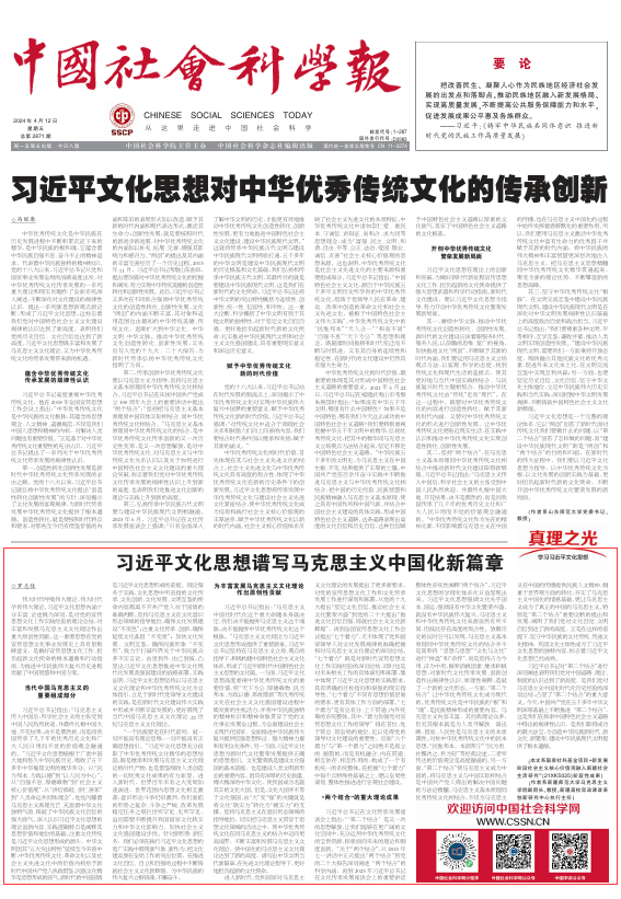 习近平总书记指出:“马克思主义传入中国后,科学社会主义的主张受到中国人民热烈欢迎,并最终扎根中国大地、开花结果,决不是偶然的,而是同我国传承了几千年的优秀历史文化和广大人民日用而不觉的价值观念融通的。”习近平文化思想植根于广袤中国大地和悠久中华民族历史,吸收了五千多年中华璀璨文明的精华养分。从“民为邦本、为政以德”到“以人民为中心”,从“自强不息、厚德载物”到“社会主义核心价值观”,从“讲信修睦、亲仁善邻”到“人类命运共同体理念”,处处闪耀着马克思主义真理光芒、充盈着中华文化独特气韵、铸就了中华民族文化自信的强大底气。深入认识习近平文化思想的理论创新内容、实践逻辑特点是阐释其思想价值和地位的基础。注重文化传统是习近平文化思想形成的源头,中华文明因其“五大突出特性”延续至今未曾中断,中华优秀传统文化、革命文化以及社会主义先进文化中的价值内核给予新时代中国共产党人执政借鉴,民族文化精华是思想形成的底气。新时代的中国国情是习近平文化思想形成的前提。理论服务于实践,文化思想中所直指的文化传承、文化创新、文化发展、文明互鉴的使命内容都离不开共产党人对于国情的准确判断。坚持马克思主义在文化意识形态领域的指导地位,确保文化发展建设“不变色”;注重文化传承、创新,确保延续文化基因“不变质”;加快文化发展、文明互鉴,确保民族形象“不变形”,致力于打破外界关于中华民族众多不实言论。由里到外、由己到彼,凸显出习近平文化思想推进中华文化现代化发展及强国建设的战略部署。实践证明,习近平文化思想坚持以马克思主义文化理论和中华优秀传统文化为总体指引,立足于新时代党领导文化建设的实践,是在新时代文化建设伟大实践中形成并不断丰富发展的,更好展现了当代中国马克思主义文化理论、21世纪马克思主义文化理论。
