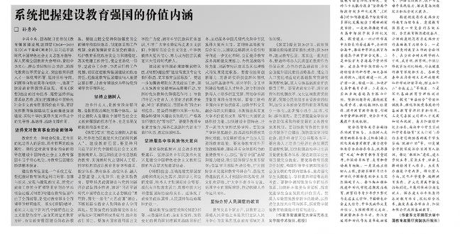 中共中央、国务院日前印发《教育强国建设规划纲要(2024—2035年)》(以下简称《纲要》),以习近平新时代中国特色社会主义思想为指导,深入贯彻全国教育大会精神,紧扣中央关心、群众关切和社会关注,将深化教育改革贯穿全文,突出教育科技人才一体统筹部署,坚持目标导向、问题导向和效果导向相统一,体现了建设教育强国的系统观。落实《纲要》提出的目标任务,需要坚持和运用系统思维,深刻把握建设中国特色社会主义教育强国的价值内涵,更好发挥教育强国建设在全面推进强国建设、实现中华民族伟大复兴伟业中的先导性、基础性、战略支撑作用。