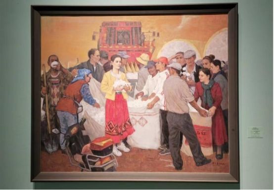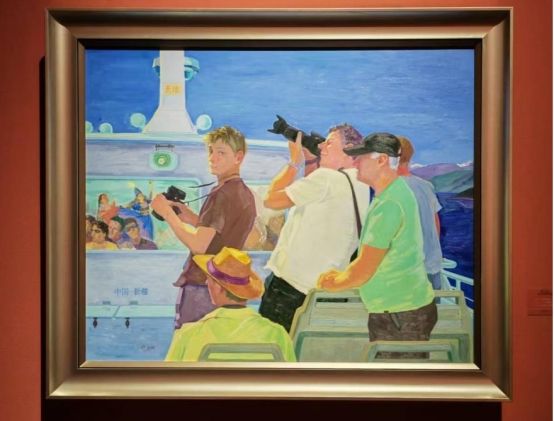 回顾70年的发展历程,新疆从传统边陲转变为向西开放的前沿、多元文明的交汇点和高质量发展的试验田。画家们也深受感染,用缤纷的色彩和深情的笔触再现70年新疆发展变迁的诸多精彩时刻。画家马勇的油画《新疆棉——沃野》以奔放的表现手法再现棉花丰收的景象。一望无际的棉花田在阳光照耀下如云海荡漾,诉说着一代代劳动者的辛勤耕耘,也象征着各族人民团结友爱和蒸蒸日上的幸福生活。在画家伊力夏提·吐尔逊的《古城新貌》中,一条条街道从画面底部蜿蜒向上,由近景的喀什老城区延伸向远处的新城区,从旧时民居错落到现代化的高楼林立,对比鲜明又和谐共融,每一处细节、每一点笔触都饱含了艺术家质朴的温情和热爱。画家王晓玲的《大美新疆丝路行·游天池》用轻松的笔触和明快的色彩描绘出一幅国际友人乘船游天池的场景,甲板上拍照留念的游客与船舱里载歌载舞的演员色彩鲜艳,神态悠闲,画面情景和谐自然。这些画面不仅是再现物质层面的飞跃,更是诠释出治理体系、文化认同、发展理念的深刻变革。在“一带一路”倡议下,新疆正以“亚欧黄金通道”和“多元文明共生示范区”的新定位,书写着铸牢中华民族共同体意识的当代实践。
