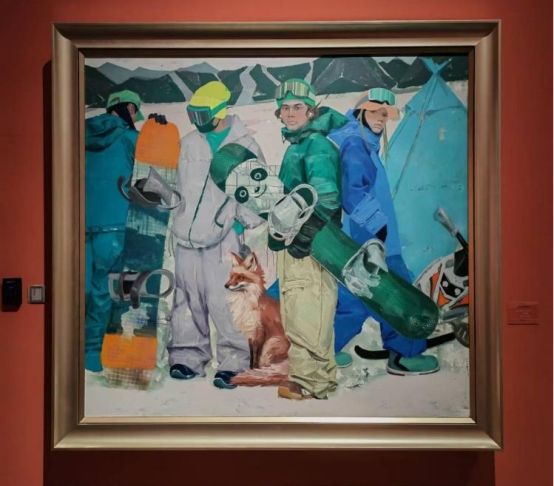 画家秦天星的作品《响动的大地之新疆山像》使用综合材料混合油画颜料,在画布上制造出龟裂的山石肌理。画家关注自然,对山体造型情有独钟,通过极具张力的构图和色彩,将自然景观升华为充满诗意的精神符号。青年画家刘贯冲的《向未来·可可托海之约3》采用新颖的绘画手法和高度概括的色彩,将冰雪运动项目与可可托海的雪域风景有机结合。画家以淡雅的浅白色表现可可托海优质的雪地资源,身穿滑雪服的青年男女为这冰天雪地增添了青春的气息与活力。在画家高江的作品《阵》中,牧民的生存智慧与自然的和谐共生关系,通过油画媒介的物性特质获得了史诗性表达。作品突破风景画的人类中心主义视角,建构起游牧生态视觉人类学的观察范式。在画家宋环的《童年记忆——父亲的棉袄》、画家冯瑜的《幸福时代——印记》、画家王铁的《高原·阳光》等油画作品中,同样可以看到人们幸福生活的温馨。画家们笔下的人物形象神态丰富,或回忆往昔,或乐于当下,或憧憬未来。画布上每一道笔触,都是海德格尔“诗意栖居”的当代注释——这或许正是边疆油画在铸牢中华民族共同体意识语境中独特的在地性价值。