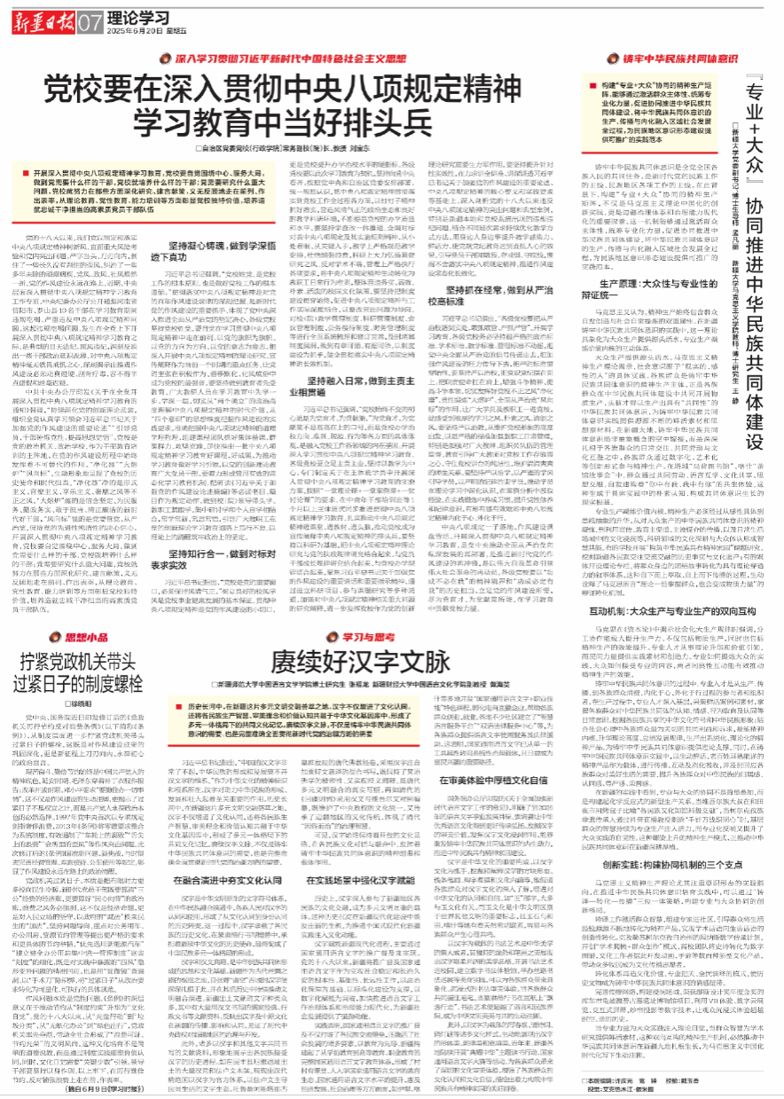 习近平总书记指出,“中国的汉文字非常了不起,中华民族的形成和发展离不开汉文字的维系。”作为中华文化的精神标识和根系所在,汉字对助力中华民族的形成、发展和壮大起着至关重要的作用。历史长河中,在新疆这片多元文明交融荟萃之地,汉字不仅增进了文化认同,还将各民族生产智慧、审美理念和价值认知共融于中华文化基因库中,形成了多元一体格局下的共同文化记忆。赓续汉字文脉,不仅是铸牢中华民族共同体意识的需要,也是完整准确全面贯彻新时代党的治疆方略的需要。