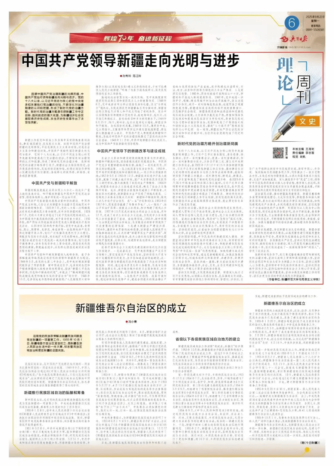 中国共产党在新疆的思想启蒙和组织建设。中国共产党成立初期,已经认识到新疆作为边疆多民族地区对中国革命的特殊作用。1922年7月,党的二大第一次明确提出反帝反封建的民主革命纲领,其中涉及新疆问题。1928年7月,党的六大审议并通过了《关于民族问题的决议》,认为中国境内少数民族的问题,对于革命有重大意义。1930年秋,共产国际从苏联派遣联共党员进入新疆地区开展相关活动。从20世纪30年代中期开始,受党中央派遣,俞秀松、陈云、陈潭秋、毛泽民、林基路等一批优秀的共产党员奔赴新疆开展工作,他们广泛传播马克思列宁主义理论,积极宣传党的方针政策,有力地扩大党的影响力,将《新疆日报》办成宣传抗日民族统一战线的重要阵地,他们投身于教育事业,培养各族青年走上革命道路,使其受到先进思想的熏陶,积极追求进步,动员群众团结起来同反动落后势力展开斗争。