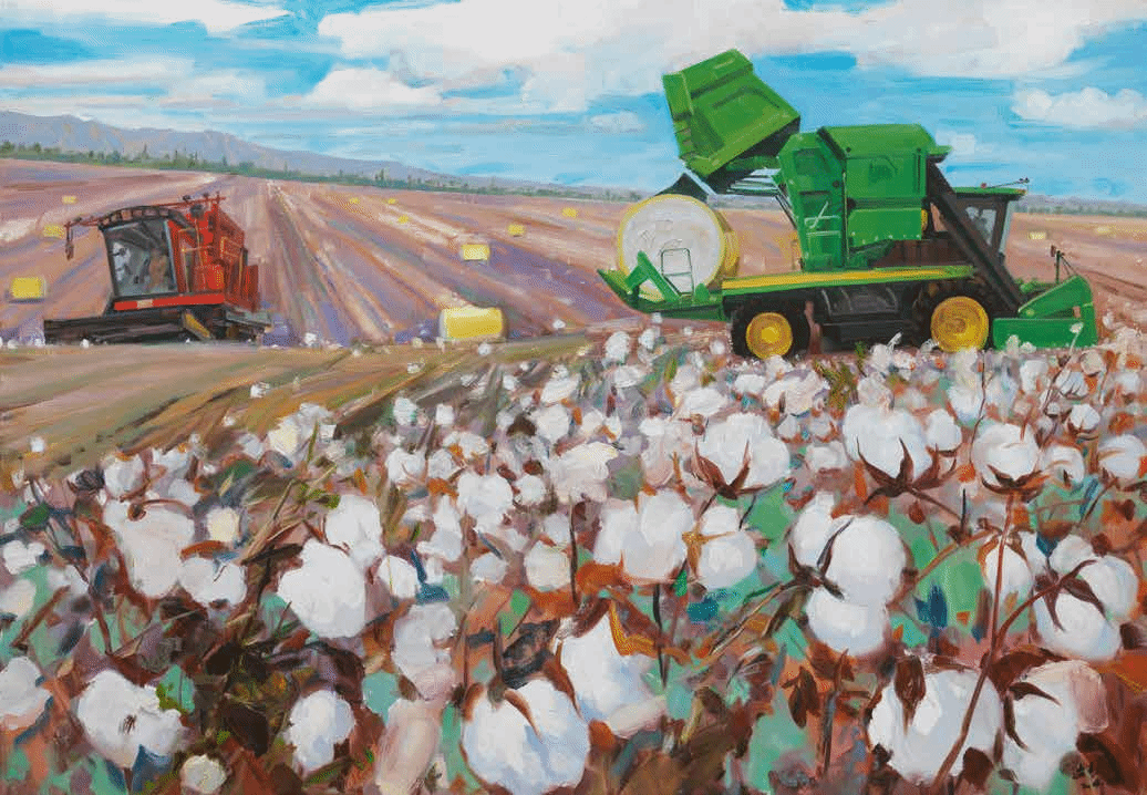 最典型的是《丰收棉田》。他用平视的角度画新疆的万亩棉田,没有按西方构成的思路,把棉田画成一片白,而是把白棉团、绿枝叶拆成一块块色块,像铺在地上的锦缎;画里一红一绿的采棉机,他没画得很大,却让它们成了“定海神针”。