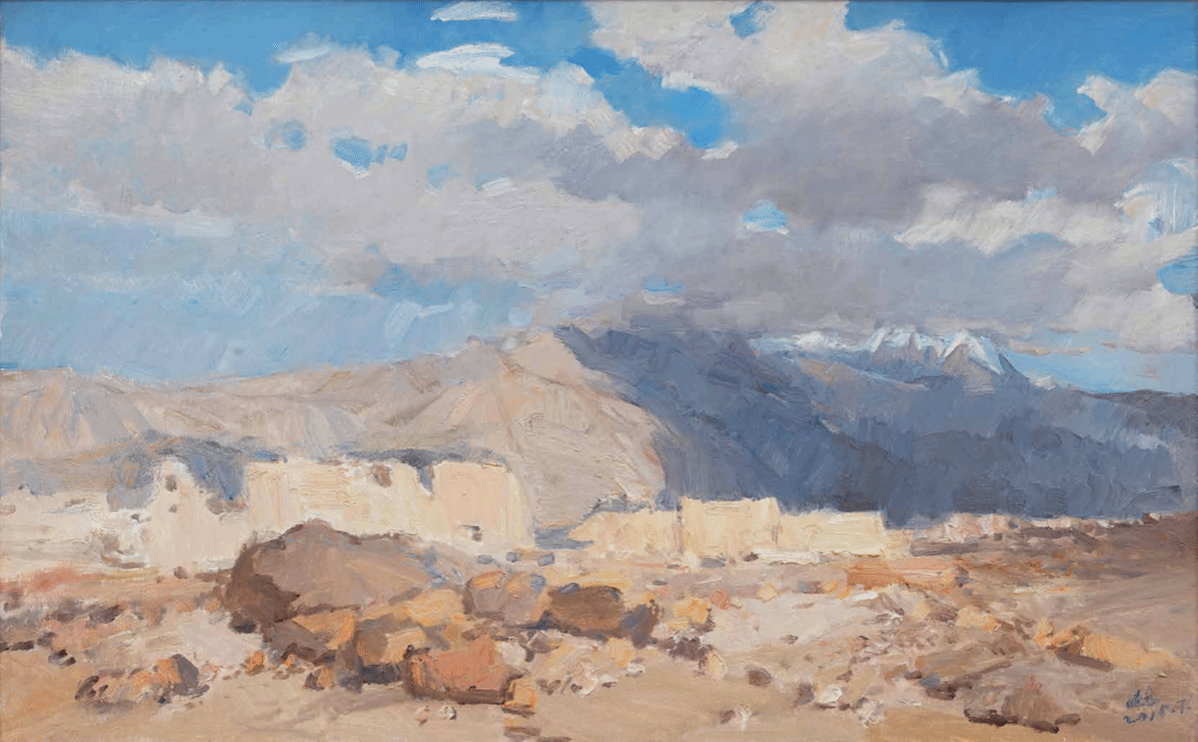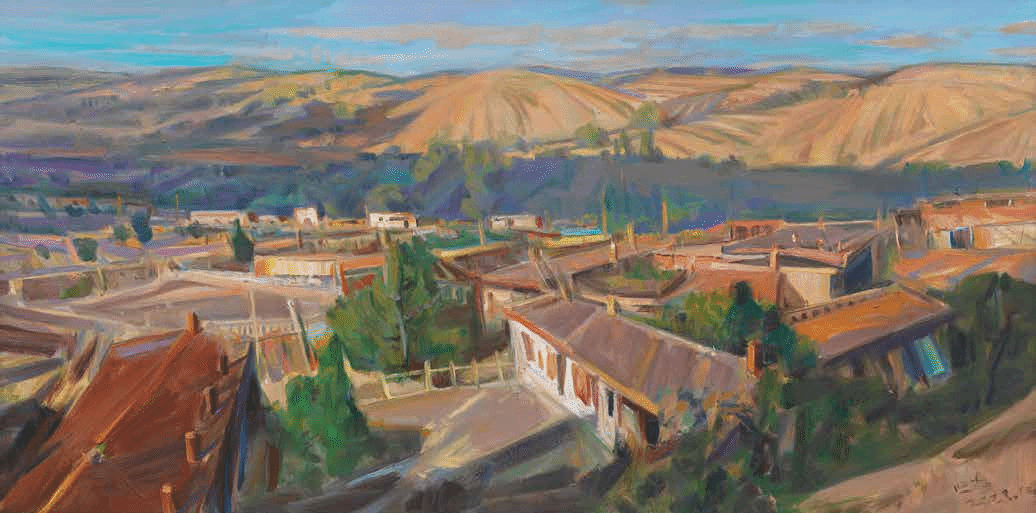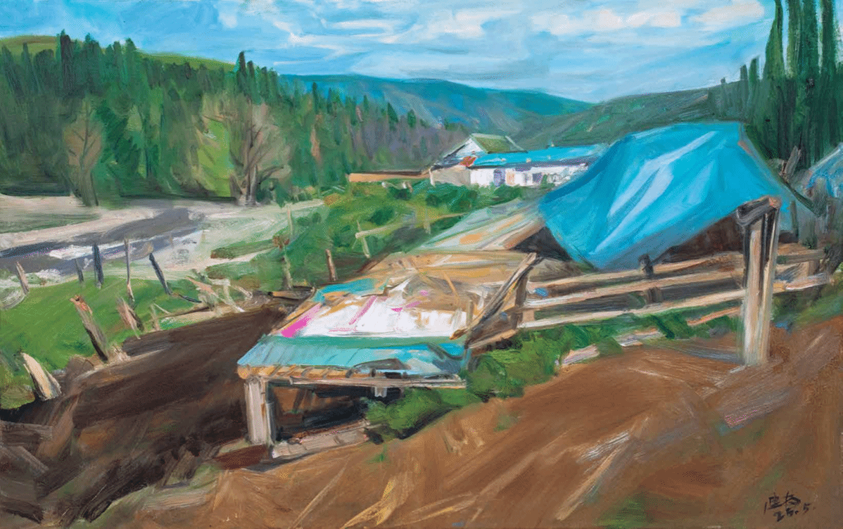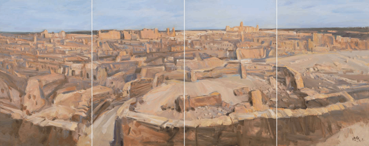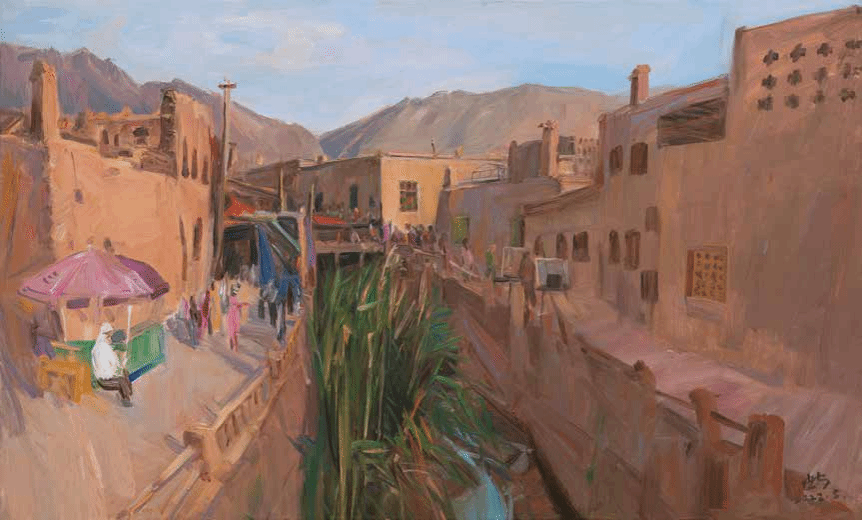 就说笔触。他不喜欢学院派那种滑溜溜的技法,偏要用“刷、摆、拖、拽”的办法画,画天山的轮廓,不是用直线勾,是用带着顿挫的线条,一下下“磕”出来的,这多像中国写意画里的“以线破形”?线条不只是画山的样子,更带着山的劲儿,像是天山常年吹着风,把线条都吹得有了动感。再看色彩,他总爱用低饱和度的灰调打底,比如《苏巴什古城遗址》的银灰、《交河故城》的土黄,这灰不是“脏”,是“沉”,像新疆的晨雾,像老城的岁月,稳稳地托着画面;然后突然来一块亮色,比如油田“磕头机”的红、棉田的白,这亮色也不是“跳”,是“透”,像太阳突然穿破雾,像棉絮突然迎着光,暗合了中国水墨“计白当黑”的画理。灰调是黑,亮色是白,一隐一显,画面就有了呼吸感,不是死的风景,是活的意境。