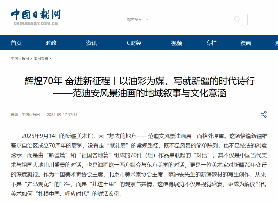 2025年9月14日的新疆美术馆,因“想去的地方——范迪安风景油画展”而格外厚重。这场恰逢新疆维吾尔自治区成立70周年的展览,没有走“献礼展”的常规路径,既不是风景的简单陈列,也不是技法的刻意炫示,而是由“新疆篇”和“祖国各地篇”组成的70件(组)作品串联起的“对话”。其不仅是中国当代美术与祖国大地山川盛景的对话;也是油画这一西方媒介与东方美学的对话;更是一位美术家对新疆70年变迁的深度凝视。作为中国美术家协会主席、北京市美术家协会主席,范迪安先生的新疆题材的写生创作,从来不是“走马观花”的写生,而是“扎进土里”的观察与共情,这使得展览不仅是视觉盛宴,更成为解读当代美术如何“扎根中国、呼应时代”的鲜活案例。
