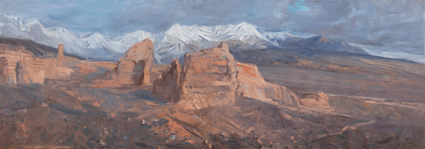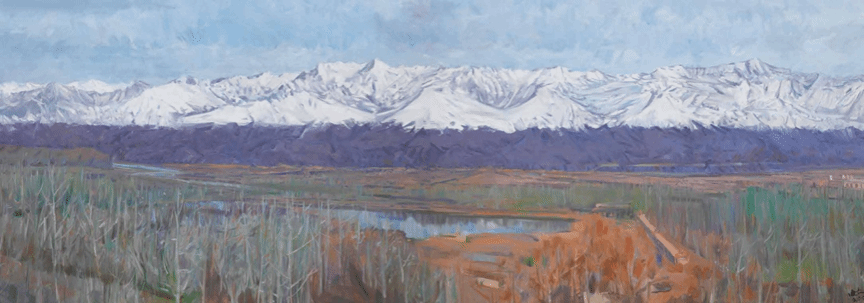 他的画里没有悬空的抒情。《克孜尔的春雪》里的紫灰色调,不是凭空设定的高级感,是他见过天山清晨的雾霭如何裹住山脉;画面中部的那抹灰紫,也不是单纯的色彩点缀,是他蹲在克孜尔的山脚下,看着太阳即将越过山尖时,给连绵不断的山脉映照的那抹诗意。这种写实不是照相式的复刻,而是带着感受的写实,他保留了写生的现场感,让观众能从画里闻到草原的青草气、夯土建筑的土腥味;但更重要的是,他把这份现场感升华为传神韵。天山的雄浑不只是体积大,是“能扛住岁月的厚重”;草原的辽阔不只是面积广,是“能装下牧人生活的从容”。这种贴着大地生长的创作,让他的油画成了新疆的视觉备忘录,可以说,范迪安先生记录的不只是风景,还有风景里的人、人的生活、生活里的时代。