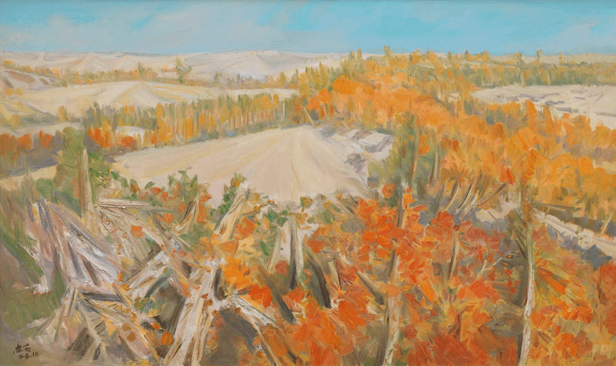范迪安先生与新疆的联结,远不止“多次踏访”那么简单。他曾多次率队参与“和美新疆——中国油画名家采风创作活动”,这个“参与”背后,是范迪安先生放下“美术界领军者”的身份,以观察者甚至参与者的姿态,去触摸新疆的肌理。他看天山的雪在不同季节的融化速度,看吐峪沟土墙在阳光下的色彩变化,看采棉机在广博的棉田上工作的节奏,也看大漠胡杨如何地千年不倒。他自己说“新疆是中国美术家神往的创作之地”,这份神往不是对地域风情的猎奇,而是对这片土地上自然、人文和人这三者共生关系的敬畏,这恰恰是范迪安先生的写生创作根基。