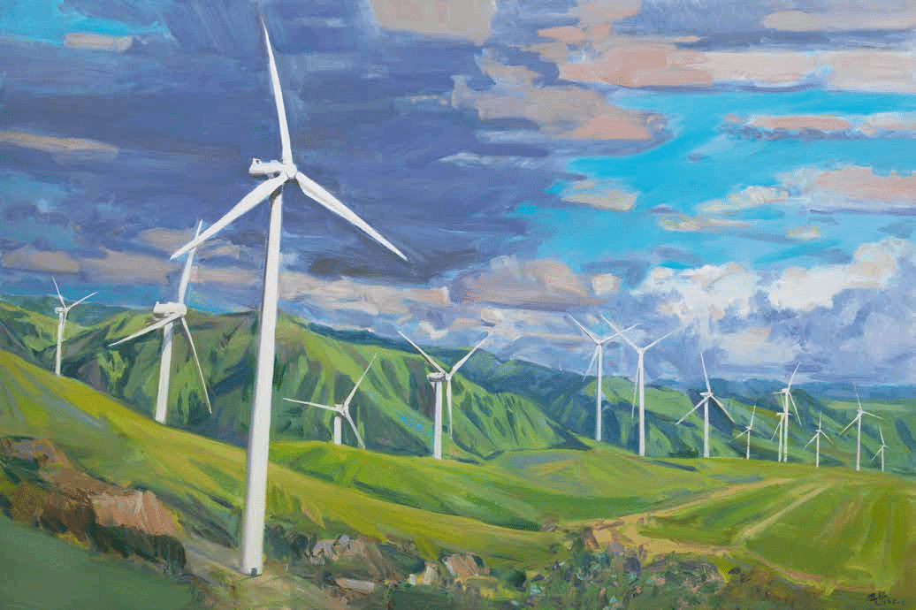 《天山风电》是他捐给新疆画院的作品。范迪安先生以油画笔触构建起天山风电场景与“疆电东送”国家战略的视觉对话。画面里,连绵天山被铺陈为深浅交织的绿,既保留自然山峦的肌理质感,又借色彩晕染传递草原生机;白色风电装机如巨人矗立,叶片动态与云层流动相呼应,既展现了工业力量,又和蓝紫相间、层次丰富的云霞形成美学平衡。画面中工业设施不再是冰冷符号,而是与天山自然风貌共生的“新风景”。画家以富有张力的色彩对比,以及写意与写实结合的笔触,消解了工业与自然的边界,让观者既感受天山风光壮美,又读懂新疆从“戈壁荒滩”到“能源绿洲”的蜕变叙事。它既是新疆风电产业的艺术记录,也成为了“文化润疆”与“能源报国”双重价值的载体,让人们从画布中看见新疆的时代担当与绿色未来。他的叙事,不是讲大道理,是用画说话,让新疆的故事自己从油彩里冒出来。
