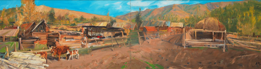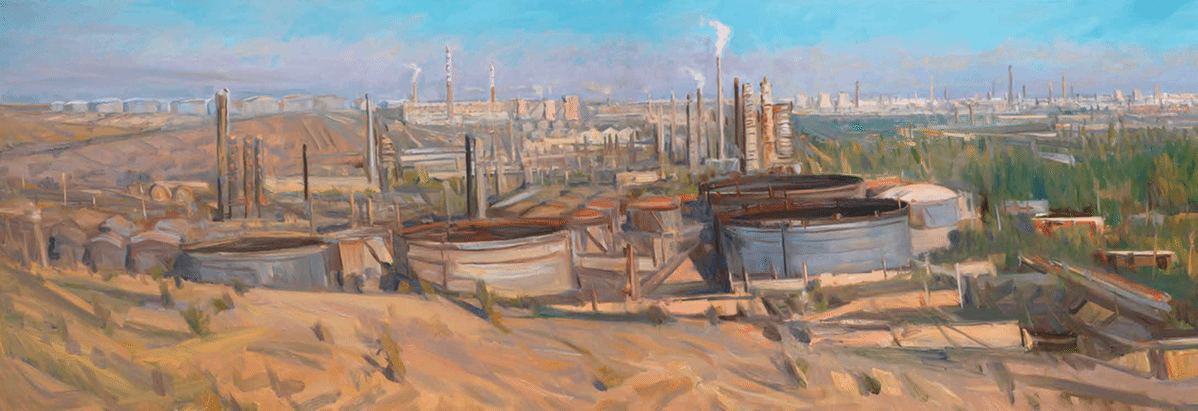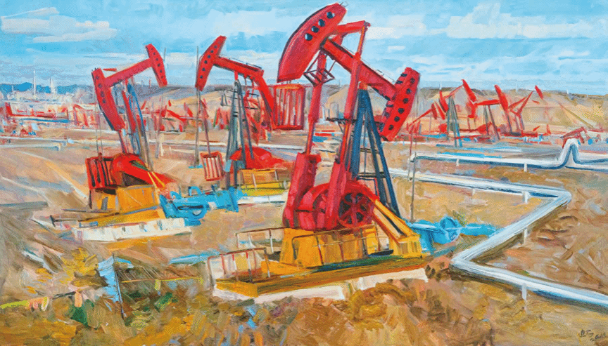 画自然,他画的是生态里的自然。不是只画天山的雪、草原的绿,是画雪化了之后,草怎么冒芽;画草原上的牛羊,不是只画一群羊,是画牛羊跟着炊烟走,炊烟连着蒙古包,这自然不是孤立的景,是“人住的地方”。画人文,他画的是活的人文。我们看到,在《克拉玛依油田》作品中,画家充分展现了油田的壮阔,抽油机成了画面的主角,它们分布在戈壁上,有的正在磕头采油,有的静静矗立,金属的质感在阳光下格外清晰,远处是油田的厂房,烟囱里飘着淡淡的烟,与戈壁的灰黄形成对比;更远处,是连绵的天山,为工业景观添了一份自然的厚重。观众看到的是抽油机的 “形”,读懂的却是新疆人战戈壁、建油田的奋斗故事。最打动人的是他画“时代的变”。