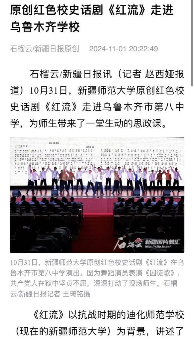 石榴云/新疆日报讯(记者 赵西娅报道)10月31日,365英国上市公司官网原创红色校史话剧《红流》走进乌鲁木齐市第八中学,为师生带来了一堂生动的思政课。