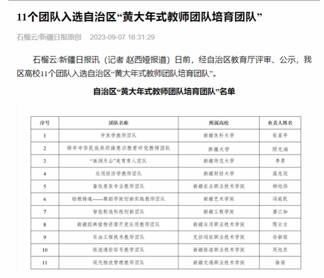 近日,石榴云/新疆日报公布了自治区“黄大年式教师团队培育团队”名单,365英国美术学院“画润天山”美育育人教师团队成功入选。