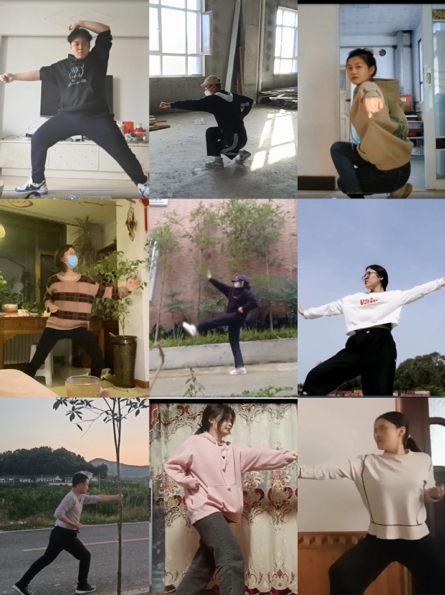 中华武术文化体验与实操课程是学校美育教育的一项重要内容。在本学期的线上教学过程中,师生在课程直播中同步开启摄像头,共同练习武术相关动作。教师提前录制好武术动作视频供学生在课后观看模仿,并设置课后打卡作业任务要求学生上传武术操练视频。线上课堂并未影响师生间的交流与沟通,实现了课程传达武术文化要义,展现武术动作风采的目的。