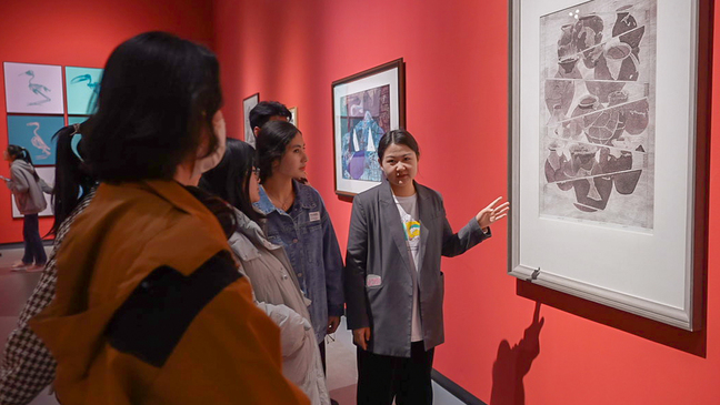 美术学院研究生为其他各专业学生介绍参展作品的艺术内涵