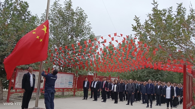 9时30分,工作队和村“两委”举行升国旗仪式,随着激昂雄壮的《义勇军进行曲》奏响,五星红旗冉冉升起,全体村民庄严肃立,向国旗行注目礼。随后开展了公民宣誓、全体村民共唱红歌《没有共产党就没有新中国》等活动,进一步激发了村民的爱国主义热情。