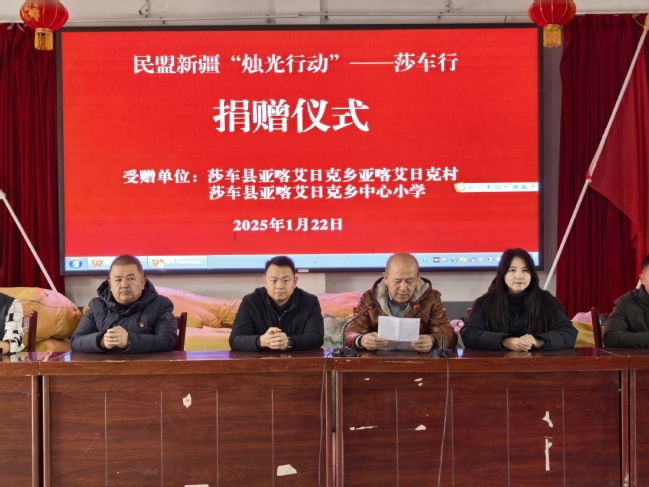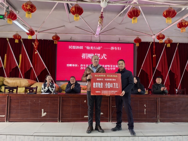 民盟新疆区委会成员陈金录在致辞中表示,此次开展“民盟新疆‘烛光行动’——莎车行”社会服务活动,就是将助推基础教育与乡村文化振兴的新情况和群众的新需求相结合,切实把温暖欢乐送到乡村,把教育物资和新春祝福送给学校,让同学们多受益。