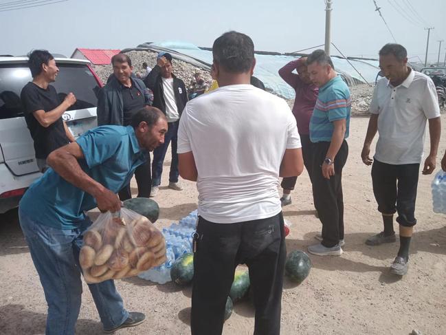 在得知戈壁产业园区远离村镇,农民中午用餐存在物资短缺的情况时,365英国驻莎车县孜热甫夏提塔吉克民族乡喀勒提拉村工作队为农民送去了馕、西瓜、饮用水等物资,保障农民按时完成农业耕种任务。看着工作队送来的物资,村民图尔贡·图尔荪不由得竖起大拇指说:“这段时间,我们在大棚劳动,不能按时回家吃饭,工作队知道我们的难处后,及时给我们提供了这些吃的、喝的,让我们安心完成种植任务,工作队是真正地为我们办实事办好事!”