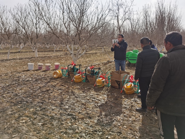 随后,工作队队员郭世华详细介绍了打药喷雾器的使用方法和注意事项等,对现场村民进行了安全使用技术培训。