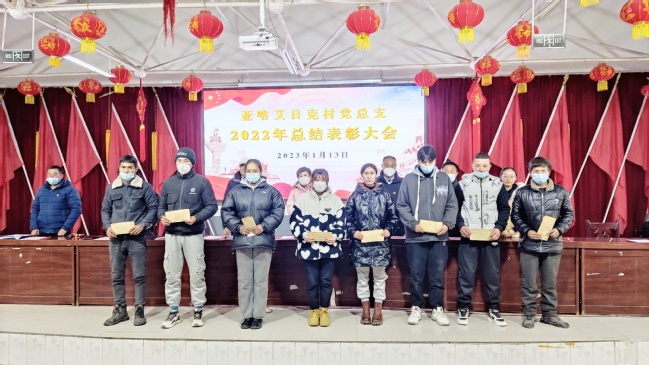 律回春渐,新元肇启。为表彰先进,弘扬社会主义核心价值观,加强乡村精神文明建设,为高质量推进乡村振兴凝聚力量,1月13日下午,亚喀艾日克村党总支召开了2022年工作总结表彰大会。大会总结了过去一年来亚喀艾日克村党总支工作开展情况,表彰了好干部、好家庭、疫情防控先进个人、民族团结先进个人、为民服务先进个人、村务参与先进个人、乡村建设特殊贡献奖等先进集体、先进个人。校党委常委、副校长、驻莎车县前方党工委书记,亚喀艾日克村党总支书记、第一书记孙秀玲出席会议并作总结讲话,亚喀艾日克乡党委书记梁秀超、“访惠聚”工作队全体成员、村两委干部、村民小队长及受表彰的先进集体和个人等150余人参加了会议。会议由亚喀艾日克村党总支副书记、工作队副队长阿不拉·玉素甫主持。