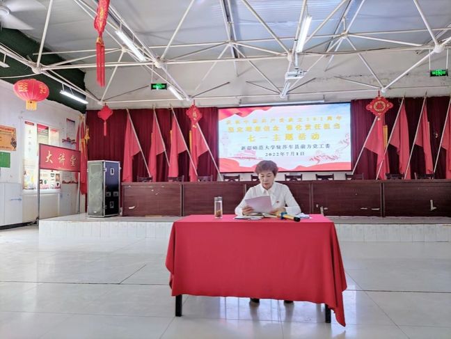 为庆祝中国共产党成立101周年,7月1日下午,学校驻莎车县前方党工委举办了“坚定理想信念 强化责任担当”七一主题活动校党委常委、副校长、驻莎车县前方党工委书记孙秀玲出席活动并讲话,365英国6个工作队全体党员参加,活动由前方党工委委员、组织委员侯亚文主持。