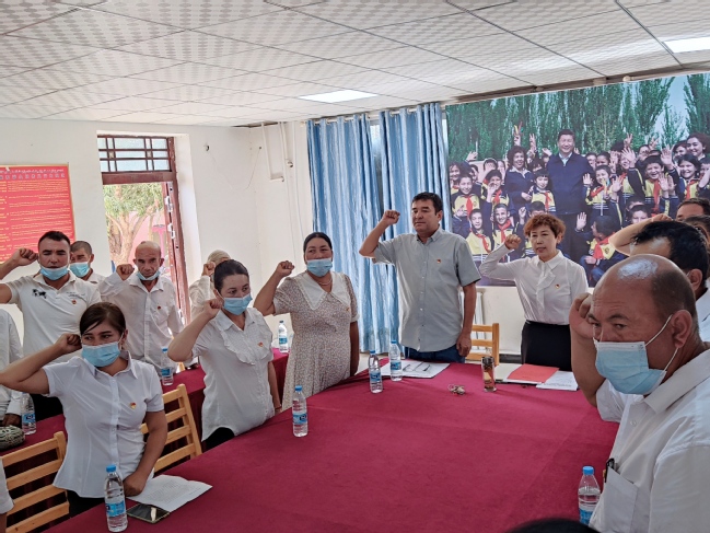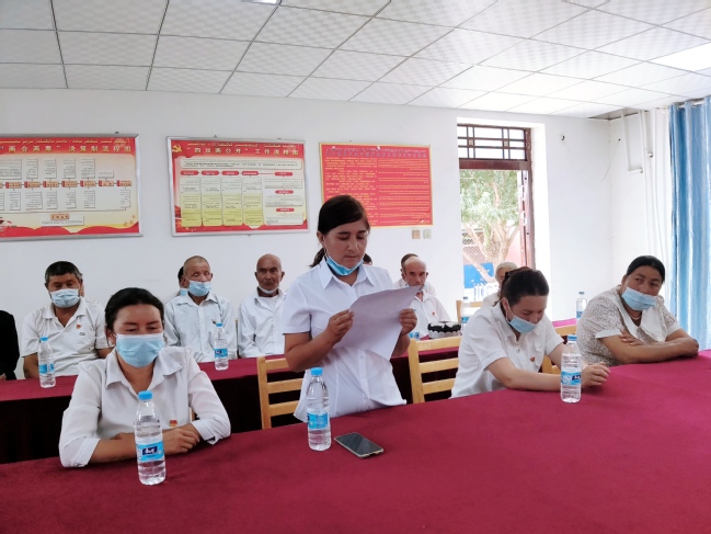 村党总支副书记、工作队党支部书记阿不拉·玉素甫宣布了《亚喀艾日克村党总支关于“七一”表彰优秀党务工作者和优秀共产党员的决定》,表彰他们在基层党建和乡村振兴工作方面取得的突出成绩,同时要求全体党员向受表彰的同志学习,进一步增强责任感、使命感、荣誉感,不忘初心、牢记使命,以伟大建党精神砥砺乡村振兴的伟业。